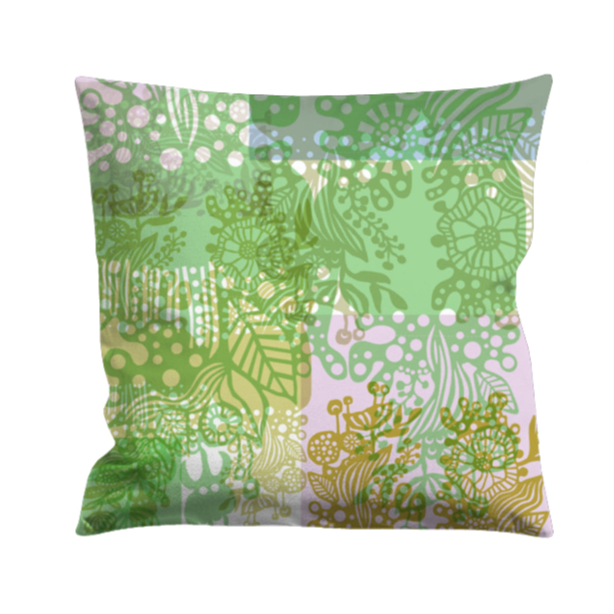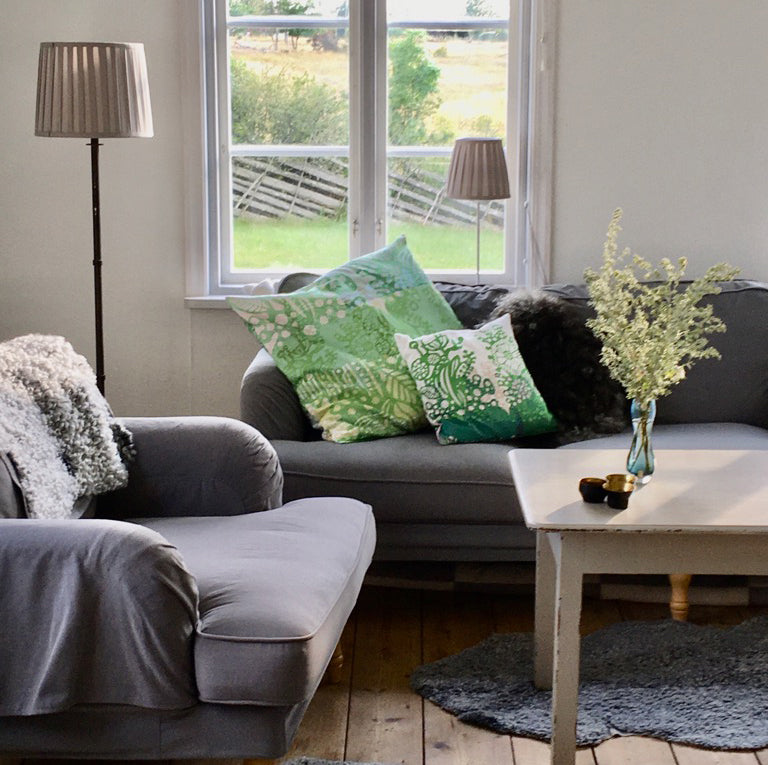 Cushion covers with a unique print from the artistic process with a design for a housing estate in Visättra for the real estate company Hemla nu Viktoriahem together with Landskapsarkitekter at HSB Stockholm.