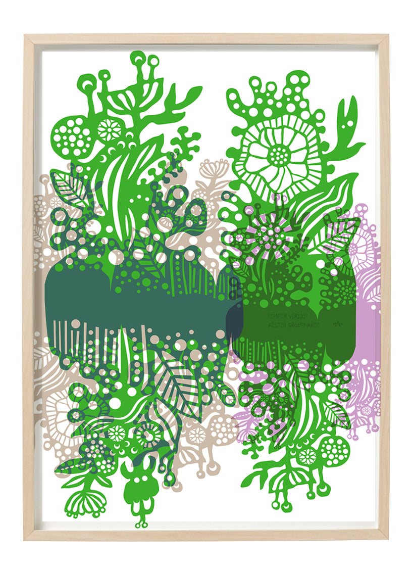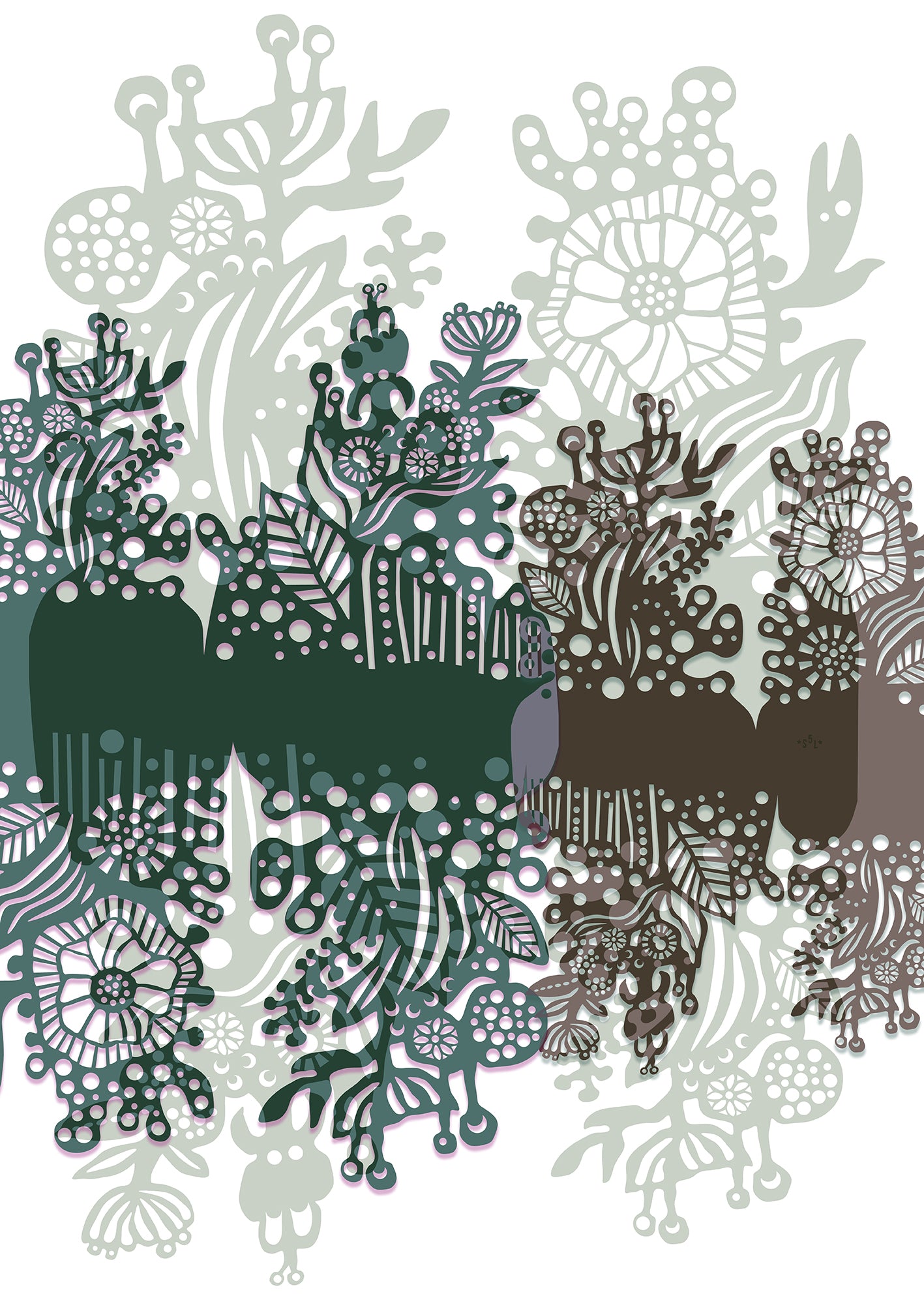 Poster som har skapats från ett mönster som togs fram i samband med ett samarbete med landskapsarkitekter på HSB stockholm när Hembla renoverade fastigheternas utemiljöer i Visättra. Helena stod för skämarna som är laserskura i cortén. På innergården placerades de tre olika utsmyckningarna som med tiden smälter in bland blomsterodlingarna. Se bilder på Instagram