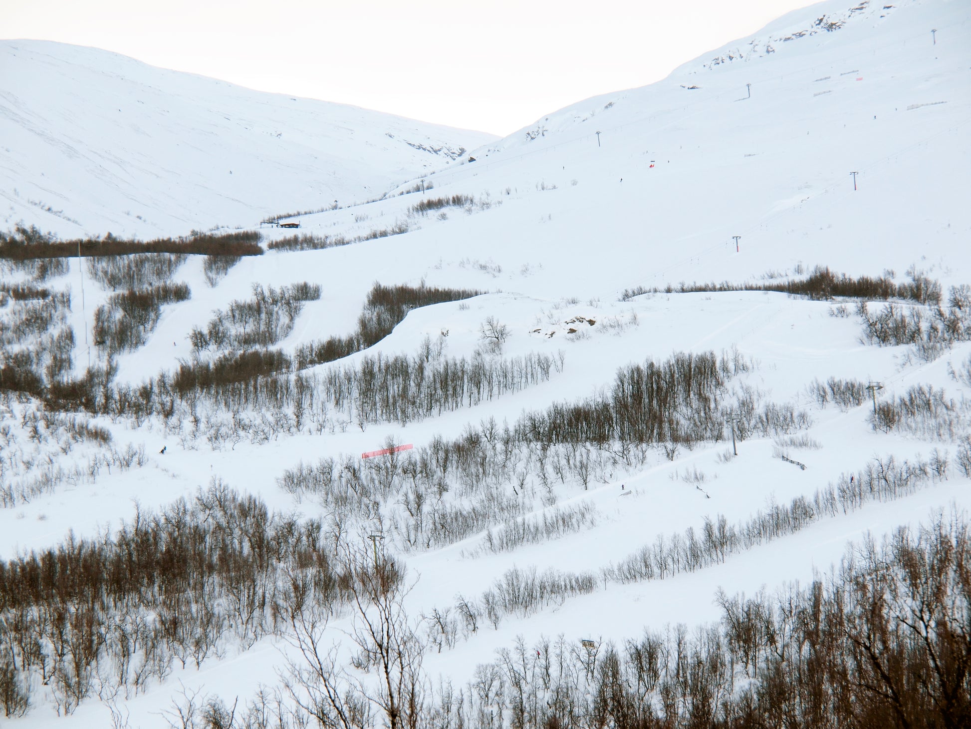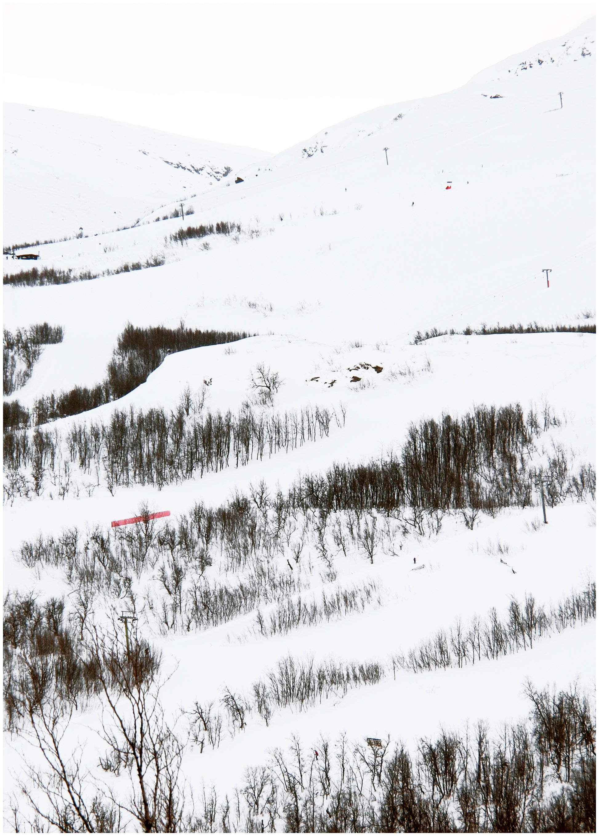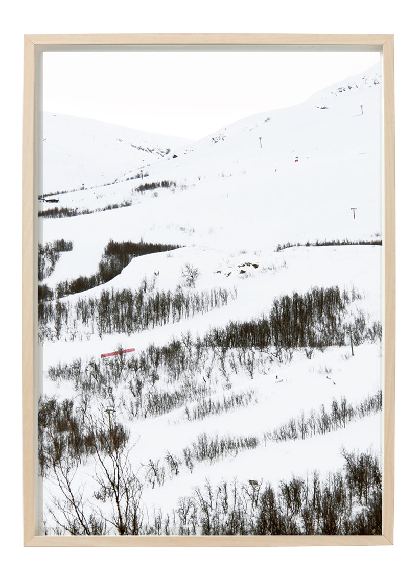 Aktivitet i backen skapar mönster tillsammans med fjällbjörkarnas klättrande upp för fjället. En del av den undersökning av snö som färg Helena gjorde 2015. Foton är tagna i Björkliden en ort efter Malmbanan vid Torneälv. Finns tryckta i en upplaga om 10 stycken.